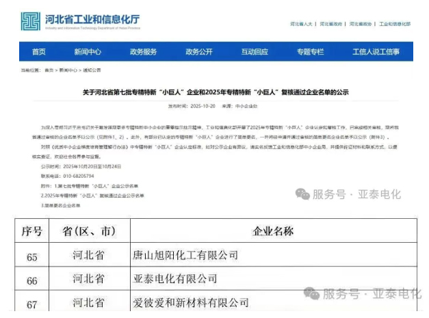 喜報│亞泰電化37年深耕行業(yè)細(xì)分領(lǐng)域,順利通過專精特新“小巨人”復(fù)核認(rèn)定